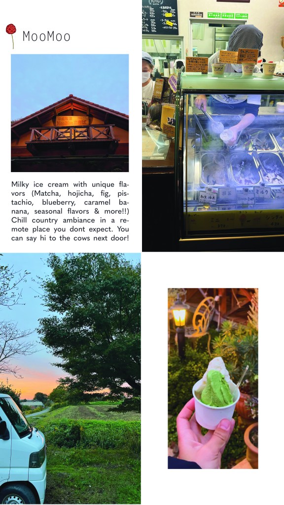 - MooMoo; creamy fresh icecream with unique flavors. I loved the hojicha flavor 🙂 Nice ambiance and say hey to the cows for me