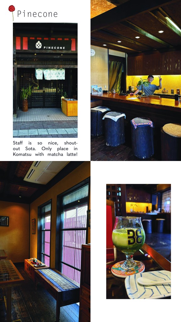 - Pinecone cafe; Nice spot to grab a matcha in Komatsu and friendly staff