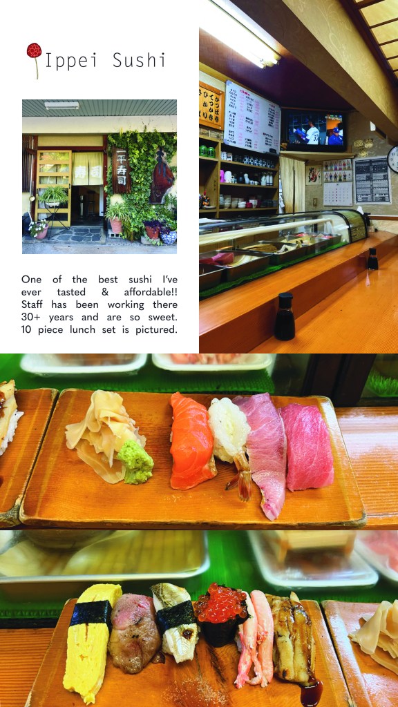 - Ippei Sushi; Apparently good sushi for a good price, I don’t eat fish so I wouldn’t know.